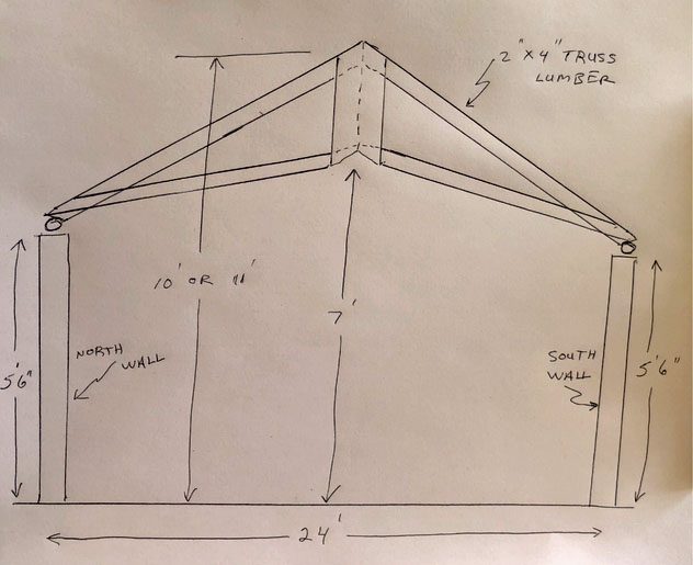 PRIVATE: A third door for opening / closing the RORO is envisioned to provide comfortable access into / out of the building for KOSC / KAS members (non-public usage). This third door should be on either the west end or the east end of the building (most likely on the east end). It is anticipated that this door should be aligned with the highest point of the engineered trusses – 7’ noted in above sketch. Note – the trusses will sit on the 5’ 6” north & south walls (approximate height in above sketch)